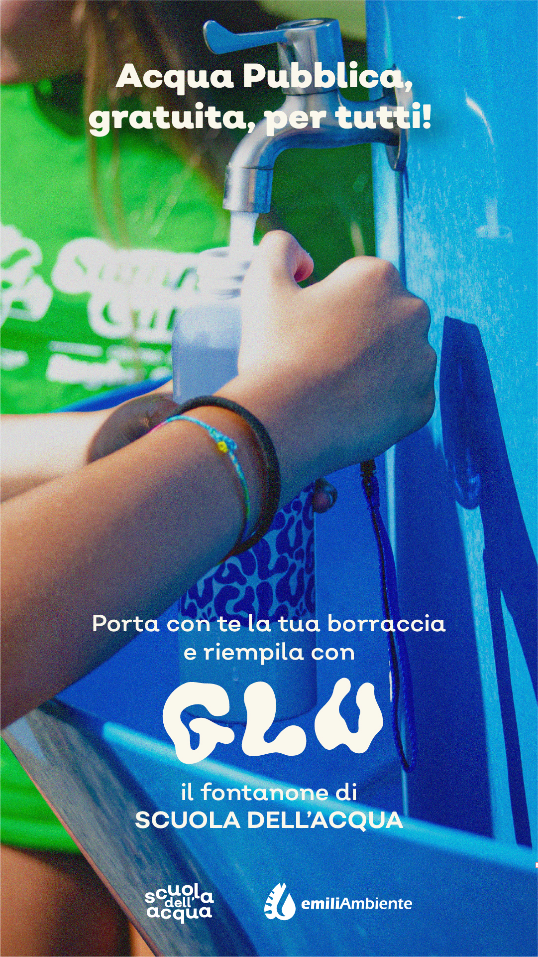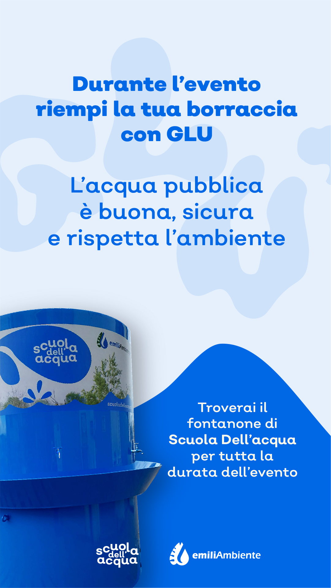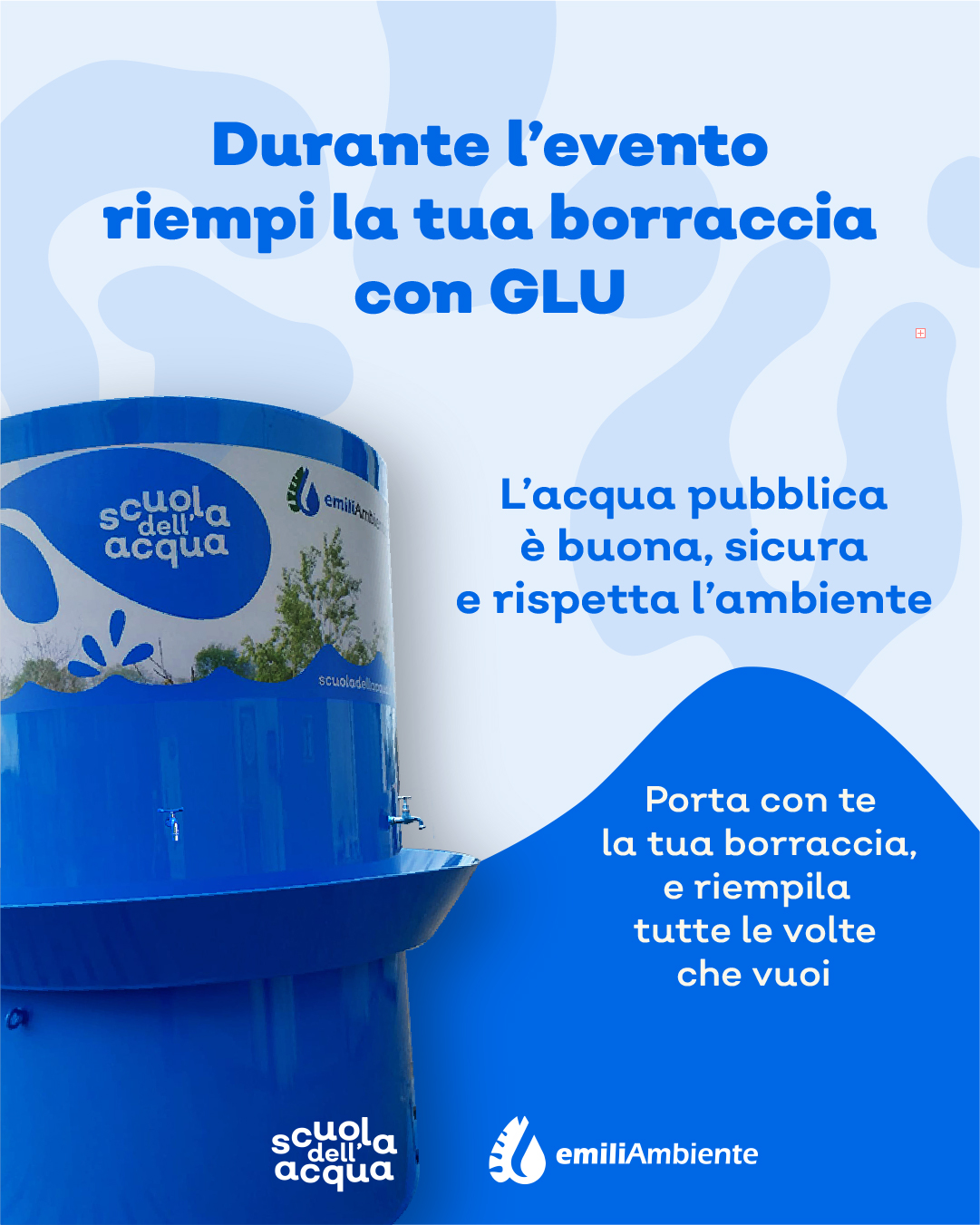 In occasione della 47^ Edizione della Mostra de''Artigianato EmiliAmbiente mette a disposizione GLU, la fontana multi-rubinetto per l’erogazione gratuita d’acqua. L’obiettivo dell’iniziativa – che è parte del progetto permanente per l’educazione alla sostenibilità “Scuola dell’Acqua” - è duplice: ridurre al massimo la produzione di rifiuti in plastica e sensibilizzare i cittadini sulla sicurezza dell’acqua del rubinetto, ponendo l’accento sul serrato sistema di controlli a cui è sottoposta. Ogni anno, infatti, EmiliAmbiente svolge complessivamente più di 290 analisi, registrando oltre 7.000 parametri, a cui si aggiungono i campionamenti svoltI da Ausl e Arpae: il risultato è un piano che punta a coprire temporalmente e spazialmente l’intera rete degli undici Comuni serviti.